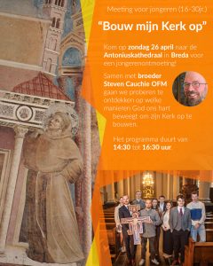 Op Roepingenzondag 26 april houdt het bisdom Breda een jongerenontmoeting over het thema ‘Bouw mijn Kerk op”. Samen met broeder Steven Cauchie OFM kunnen jongeren van 16 tot 30 jaar met hem en met elkaar in gesprek gaan over hoe God ons hart beweegt om zijn Kerk op te bouwen. Meer info is te lezen via de link Jongerenontmoeting: ‘Bouw mijn Kerk op’ – Bisdom Breda