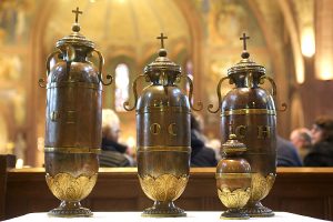 In de Goede Week worden ieder jaar de heilige oliën gezegend en gewijd: de catechumenenolie voor wie worden voorbereid op de doop, de ziekenolie voor het toedienen van de ziekenzalving en het Heilig Chrisma voor de dopelingen en de vormelingen. Tijdens het ontvangen van de sacramenten komt God, op z’n sterkst, bij ons mensen aanwezig.  Deze wijding wordt gedaan door de bisschop tijdens de Chrismamis.